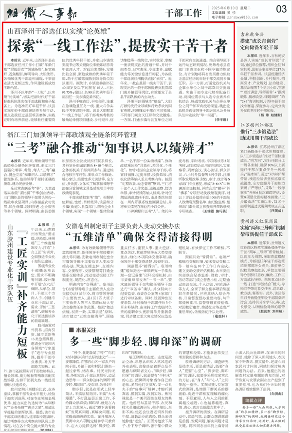 泽州不唯资历、不唯台阶,注重在急难险重任务一线、重大斗争实践中考察识别干部。该县大胆探索“一线工作法”,将干部考察考核的触角延伸到项目建设、乡村振兴、信访维稳等一线岗位,实时收录、掌握一批表现突出的普通干部,并对干部类型、日常表现、专业素养、禀赋能力等关键信息进行标记,为各级干部选拔任用提供直接“索引”。近年来,一批在基层一线实干苦干、表现突出的一般干部被提拔到县直部门或乡镇领导岗位,有效激发了全县干部队伍的内生动力。