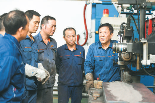 “七一勋章”获得者大国工匠艾爱国(右一)在实验室和同事探讨焊接技术