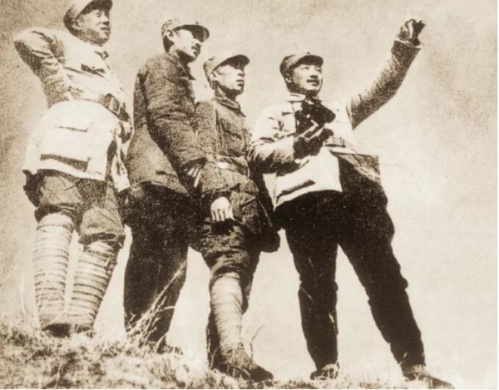 1937年10月18日,八路军第一二〇师一部在雁门关以南伏击日军汽车运输队,一度阻断了忻口正面之敌的地面补给线。图为第一二〇师领导在前线观察地形。右起为贺龙、周士第、关向应、甘泗淇。