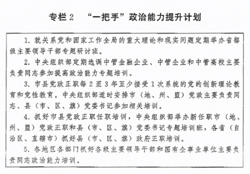 (二)突出“关键少数”政治训练。坚持把政治训练贯穿干部成长全周期,使干部的政治素养、政治能力与担负的领导职责相匹配。强化“一把手”政治培训,有计划地选调地方、部门、国有企事业单位主要负责同志到党校(行政学院)、干部学院参加专题培训。实施“一把手”政治能力提升计划(专栏2)。省(自治区、直辖市)、市(地、州、盟)、县(市、区、旗)党政领导班子成员每2至3年到党校(行政学院)、干部学院至少接受1次系统的党的创新理论教育和党性教育,5年内累计不少于2个月。围绕提高政治能力和领导能力,加强机关司局长、处长任职培训。重视对女干部、少数民族干部、党外干部等的政治培训。加强对高层次人才的政治引领,中央组织部会同有关单位每年组织一定数量人才开展国情研修。