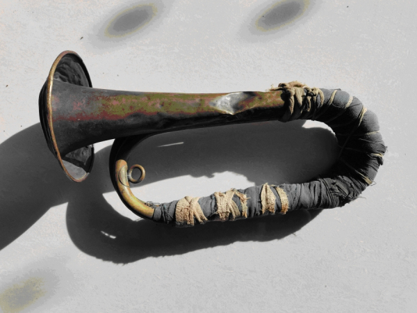 一把是红军长征时期,红军战士刘明龙(1916—2006),四川达县人,1933年参加中国工农红军,1936年加入中国共产党,历任司号员、班长、文书、指导员,团政治处主任,厅级干部。解放后分配到天津铁路局工作,公安部科长、太原铁路局公安处政治处主任、科长、副处长,成都铁路局公安处政治处主任、顾问。在上党战役中负伤,与高平寺庄镇市望村尚桂英(乳名花灯)(1919—2008)结为连理。保存一件使用多年的“冲锋号”,这把“冲锋号”已经破烂不堪,但是通过缠绕在上面的丝帛,可以看到主人对器物的珍爱程度。视为他的眼睛,视为他的生命,为我们今天能够看到红军二万五千里,长途跋涉,历尽艰辛与苦难的真实战争场面,是多么的惊心动魄。他能珍藏于今,已经表达了器物主人的革命情怀。