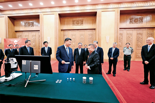 2024年9月23日,党和国家领导人习近平、李强、赵乐际、王沪宁、蔡奇、丁薛祥、李希等在人民大会堂接见探月工程嫦娥六号任务参研参试人员代表并参观月球样品和探月工程成果展览。这是习近平等参观月球样品和探月工程成果展览。 新华社记者 谢环驰/摄