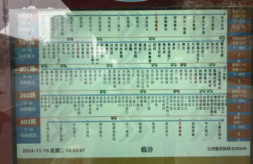 公交线路、运营时间、车辆到达所需时间等信息“一屏可览”;在搜索框输入目的地,可以显示线路规划,包括出行方式、换乘线路等……临汾在市内142个主要站点设置了电子公交站牌,市民可以随时了解“有没有车”“车什么时候能来”等信息。