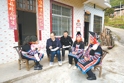 图为吕晓毛(右四)在塔山瑶族乡西江村走访,听取群众对粽叶种植、加工等方面的需求和建议。