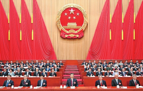 人民大会堂大礼堂气氛庄重热烈,主席台帷幕正中的国徽与会场穹顶上的五角星灯交相辉映。