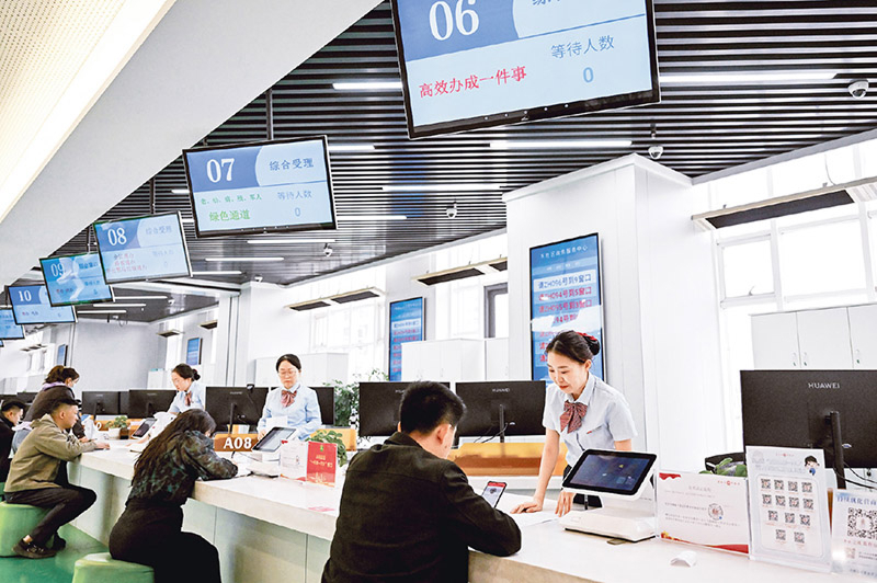 把为基层减负落到实处,需要各级党组织把“应减之负”减下去,把“应尽之责”担起来,将减负成效化作新征程上真抓实干、攻坚克难的强大动力。图为2025年4月16日,在内蒙古鄂尔多斯市东胜区政务服务中心,工作人员办理民营企业相关业务,以综合举措持续优化营商环境。