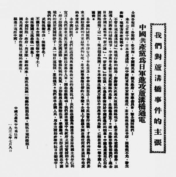 1937年7月7日,日军进攻北平(今北京)宛平县卢沟桥,国民革命军第二十九军奋起抵抗,中华民族的抗日战争全面爆发。7月8日,中国共产党向全国发出通电,呼吁全民族抗战,筑成民族统一战线的坚固长城,抵抗日本帝国主义的侵略。图为通电全文。