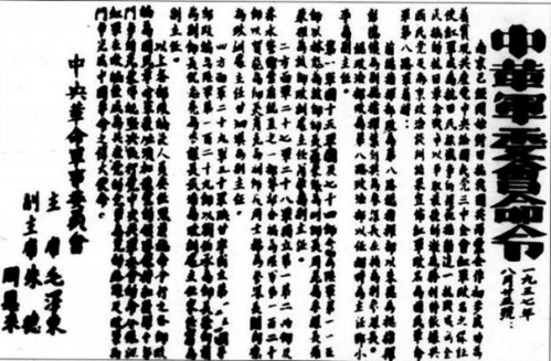 中共中央革命军事委员会主席毛泽东,副主席朱德、周恩来关于红军改编为国民革命军第八路军的命令。