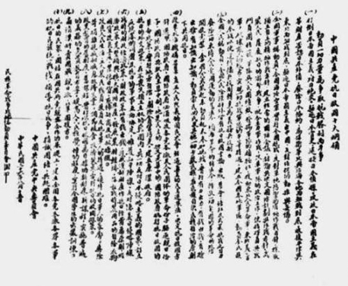 1937年8月22日至25日,中共中央在陕北洛川召开政治局扩大会议,制定了全面抗战的路线、纲领和政策。图为会议通过的《中国共产党抗日救国十大纲领》。