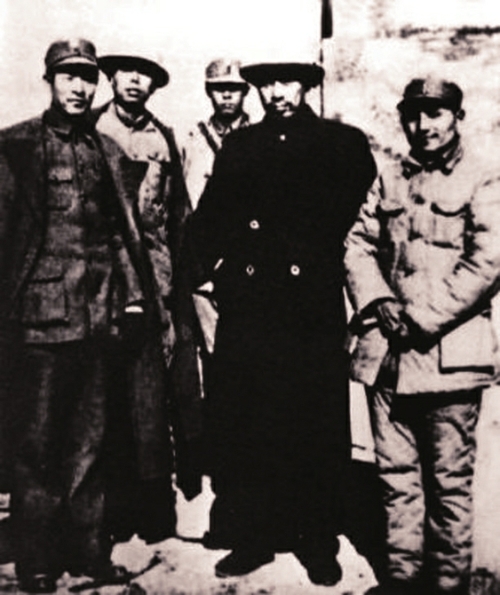 1937年9月,中共中央代表周恩来赴晋协商有关八路军对敌作战事宜,并同刘少奇、朱德、彭德怀一起,根据中共中央军委的指示,部署和推动以山西为中心的华北抗日战争。图为周恩来(右二)、邓小平(右一)等在太原。