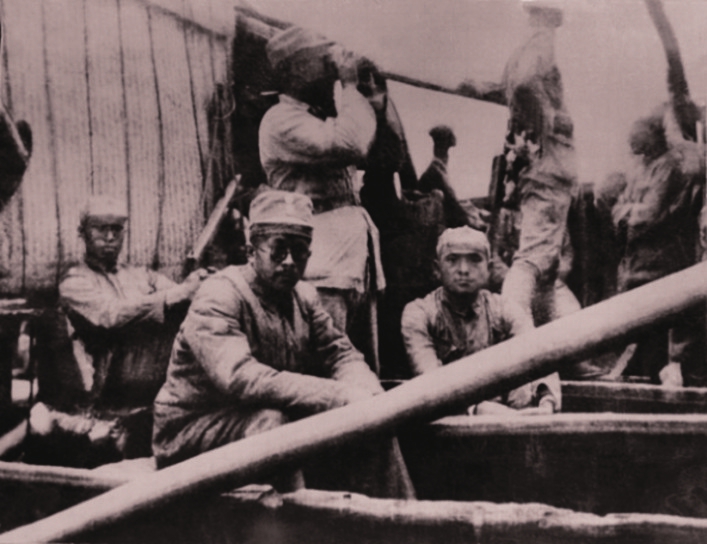 1937年9月6日,八路军总部由陕西泾阳县云阳镇东进,15日渡河,21日到太原,23日到五台县南茹村。图为9月15日,朱德(拿望远镜者)、任弼时(坐者左二)、邓小平(坐者右一)、左权(坐者左一)等乘船东渡黄河,奔赴山西抗日前线。