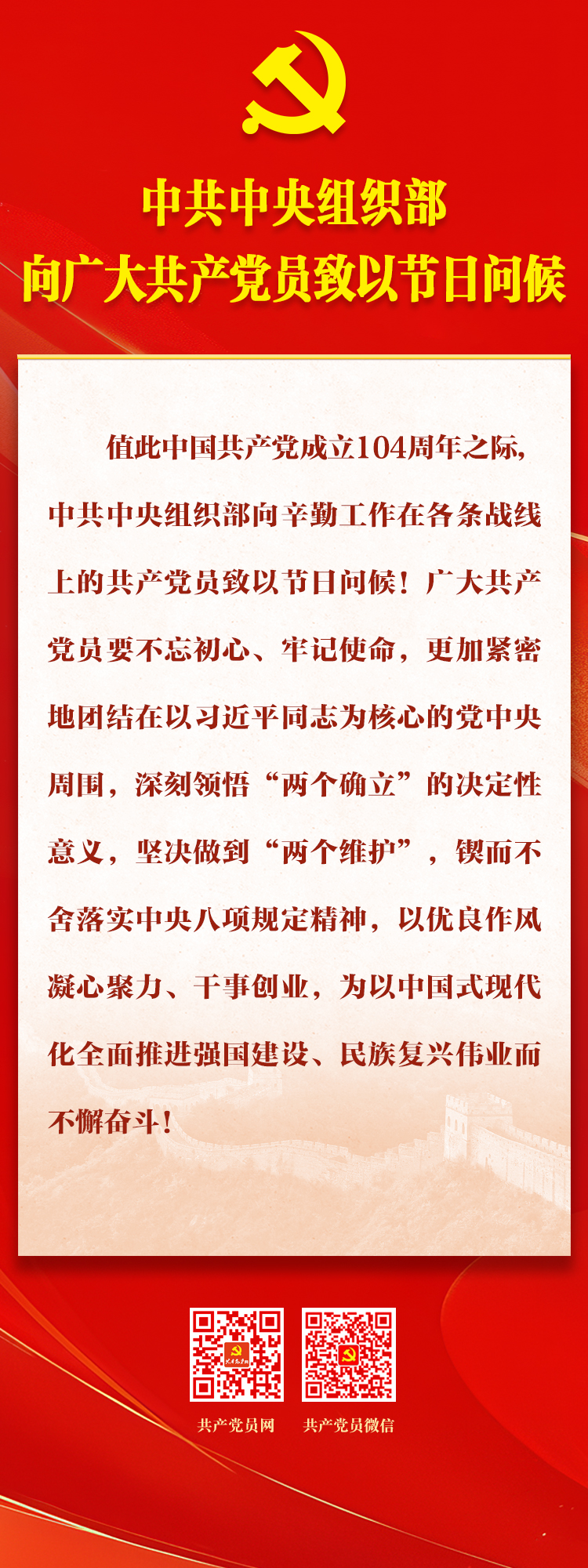 中共中央组织部向广大共产党员致以节日问候