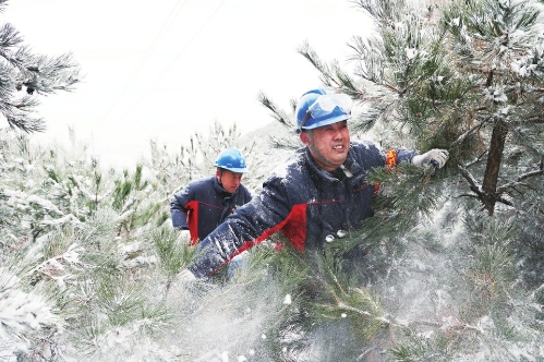 图⑤为国网长治供电公司“两队”队员深入积雪松林仔细排查线路通道隐患。郭海波摄