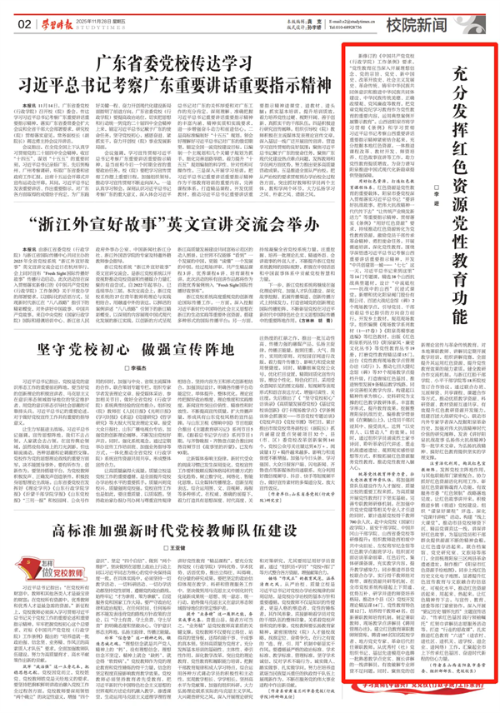注重活化利用,构筑红色宣教矩阵。发挥党校主阵地作用,与其他职能部门紧密配合,协力抓好红色资源活化利用工作,彰显红色资源铸魂育人功能,有效服务市委“红色领航”战略落地见效。让红色故事讲开来。积极推进乡镇(街道)党校建设,组织“漾泉好课程”评选,深化“党课开讲啦”活动,构建“线上大课堂”,推动市县党校师资下沉、精品党课直达一线,讲深讲好红色故事,为基层党员和干部群众提供源源不断的精神食粮。让红色遗存活起来。联合档案馆、党史研究室、文旅局等部门,全面梳理阳泉三区两县革命遗迹遗址,制作推广《阳泉市红色资源手绘地图》,同步上线红色历史文化电子地图,显著提升红色宣传教育与文旅融合的信息化、可视化水平,推动红色资源活起来、用起来、热起来。让红色精神传下去。与宣传、教育、团委等部门紧密协作,深入开展“铭记历史缅怀先烈”主题宣传活动、“传承红色基因践行领袖嘱托”红领巾讲解员志愿服务活动等,打造“行走的思政课”,扎实推进红色教育“六进”(进农村、进社区、进机关、进学校、进企业、进网络)工作,汇聚起全市上下传承红色基因、奋进时代新程的信心力量。