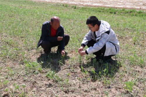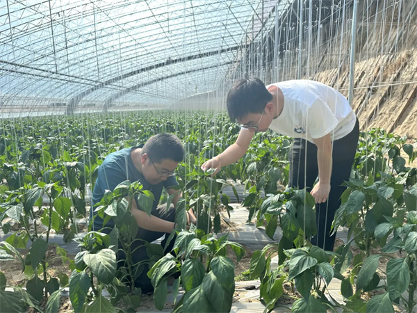 ▲离任村“两委”主干为村党组织后备力量实地介绍村内特色种植项目。