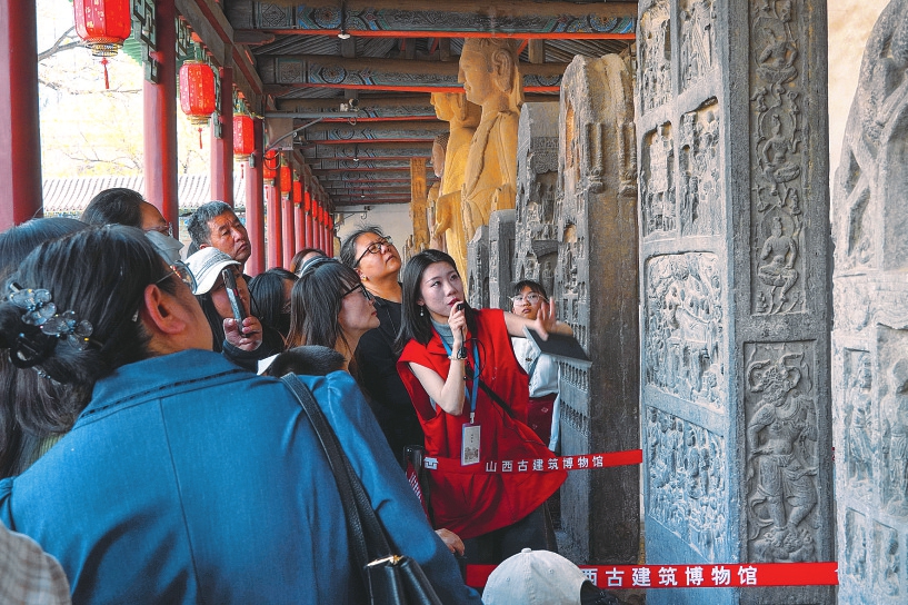 讲解员为游客介绍山西古建筑博物馆内的碑林石刻。