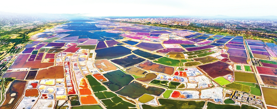 运城盐湖景区呈现出色彩斑斓的绚丽景色,宛如大地调色板,美不胜收。薛俊摄