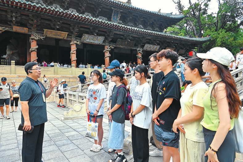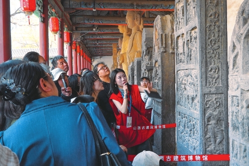 专家向游客讲述晋祠圣母殿设计营造的精妙之处。