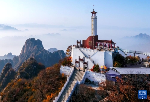 这是狼牙山棋盘陀峰顶的“狼牙山五勇士纪念塔”(2017年10月27日摄,无人机照片)。新华社发